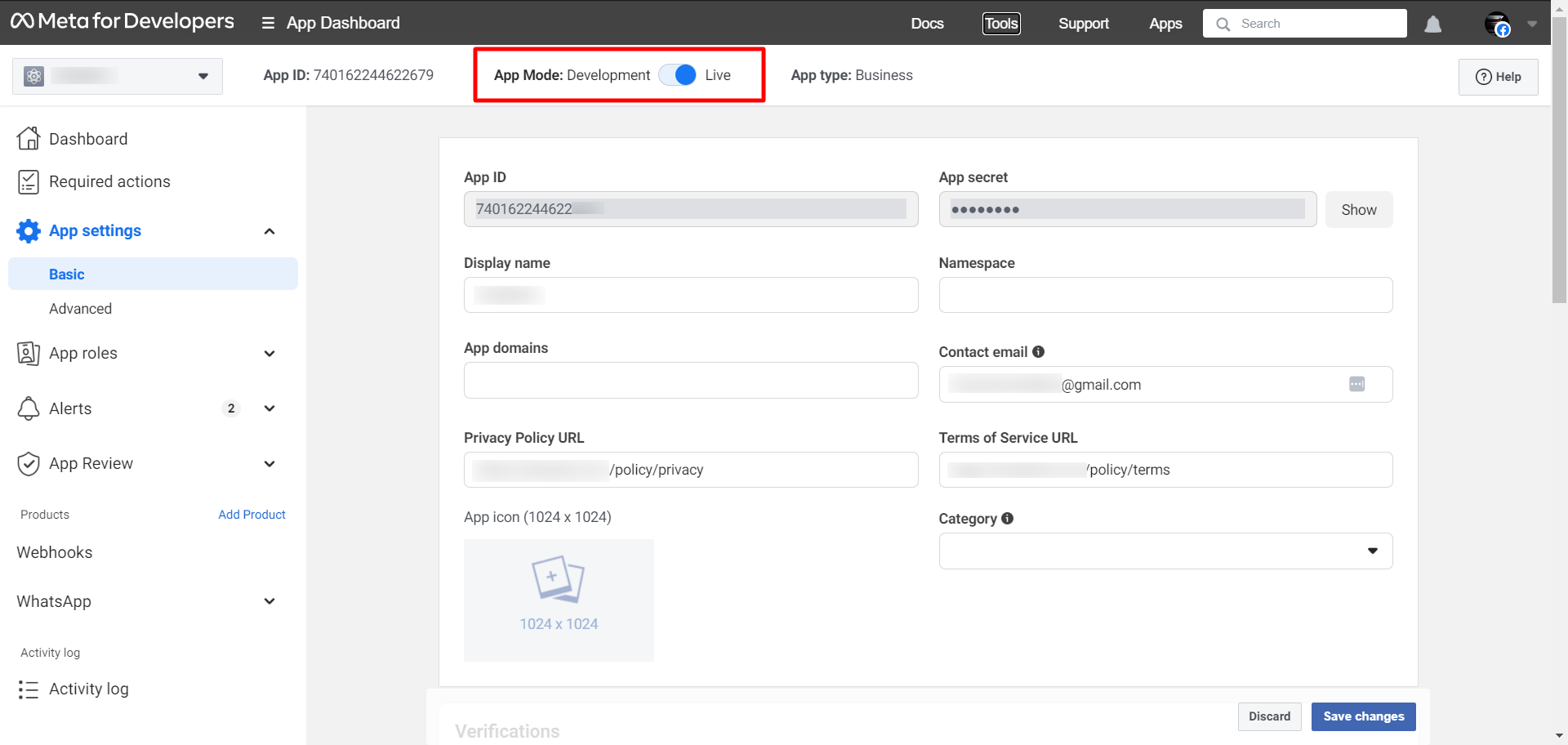 Then from the App settings, click on the Basic option and add the Privacy Policy URL and Terms of Service URL from the Chat Mercato. These URLs are available on the Connect bot page of Chat Mercato. After adding these URLs just click on the “Save changes” button.