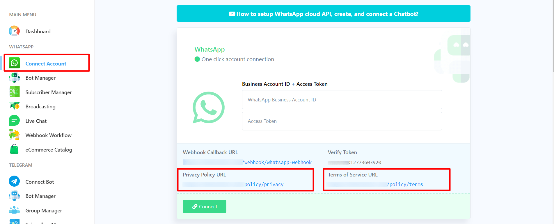 To get the callback URL and verify the token from Chat Mercato. Login to your account and go to the dashboard of Chat Mercato. At the left sidebar of the Dashboard, under the WhatsApp section, you will see connect WhatsApp option. Now click on the connect WhatsApp menu and instantly, Connect WhatsApp Business page will appear.