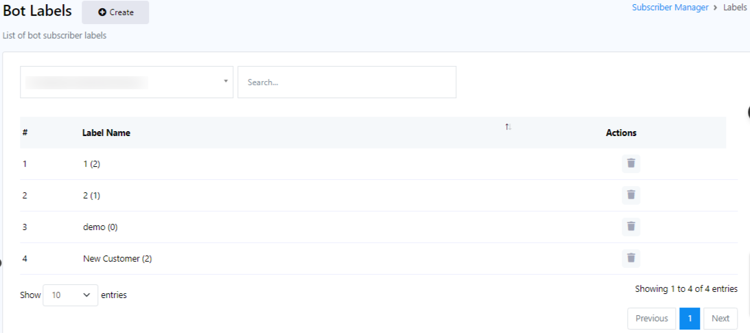 From the Bot Label, click on the `Create` button to create a new label. A pop-up form will appear with two fields: `Label Name` and `Select Bot`.